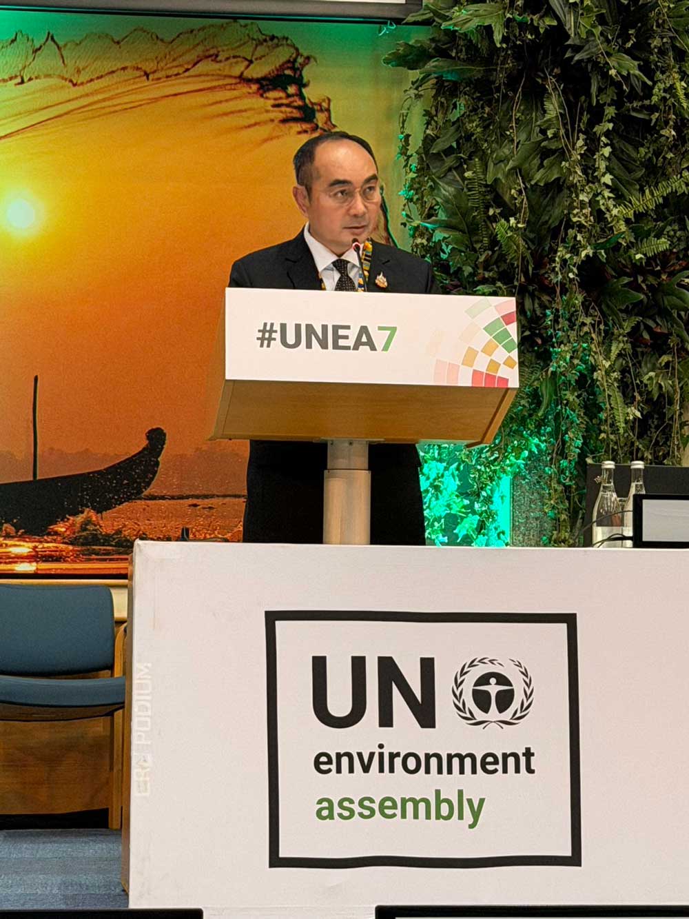 นายสุชาติ ชมกลิ่น รองนายกรัฐมนตรี และรัฐมนตรีว่าการกระทรวงทรัพยากรธรรมชาติและสิ่งแวดล้อม มอบหมายให้ นายประเสริฐ ศิรินภาพร รองปลัดกระทรวงทรัพยากรธรรมชาติและสิ่งแวดล้อม เป็นหัวหน้าคณะผู้แทนไทย เข้าร่วมการประชุมสมัชชาสิ่งแวดล้อมแห่งสหประชาชาติ สมัยที่ 7 (UNEA-7) ระหว่างวันที่ 11 – 12 ธันวาคม 2568 ณ สำนักงานใหญ่โครงการสิ่งแวดล้อมแห่งสหประชาชาติ กรุงไนโรบี สาธารณรัฐเคนยา ภายใต้หัวข้อหลัก “Advancing Sustainable Solutions for a Resilient Planet” โดยมีองค์ประกอบคณะผู้แทนไทยประกอบด้วย นางสาวกานดา ชูแก้ว รองเลขาธิการ สผ. นางสาวมัณฑนา ศิริวรรณ ผู้อำนวยการกองยุทธศาสตร์และแผนงาน และผู้แทนหน่วยงานที่เกี่ยวข้อง ได้แก่ กรมควบคุมมลพิษกรมการเปลี่ยนแปลงสภาพภูมิอากาศและสิ่งแวดล้อม สำนักงานปลัดกระทรวงทรัพยากรธรรมชาติ และสิ่งแวดล้อม และกระทรวงการต่างประเทศ